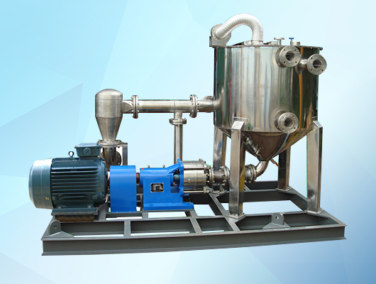 HFM型分散研磨器装置(撬)由溶解罐、分散研磨机和混合器组成。溶解罐设有切向的一次进水口,进水与上部的物料进入罐内,罐顶的搅拌机使其旋转搅拌,达到初步的混合。随后由下部的出口进入分散研磨机,使通过机器的物料能同时完成粉碎、分散、乳化、均质和输送。混合器利用文丘里管形分配器把分散粉碎机的来液和二次进水送入旋流混合和静态混合,以达到均匀分散溶解的最佳效果。